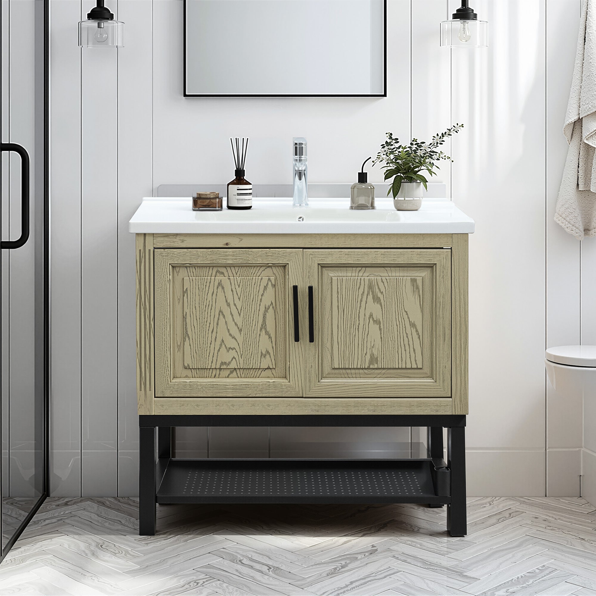 This bathroom vanity is designed to provide a complete, modern solution for your bathroom upgrade. This all-in-one set comes with a faucet and a high-quality ceramic sink, saving you time and the hassle of separate purchases. The cabinet offers substantial storage space, while the soft-close hinges and adjustable anti slip legs add a touch of premium functionality. Featuring a sleek grey finish and durable iron mesh panels, this vanity combines style with practical design for a quick and easy installation.