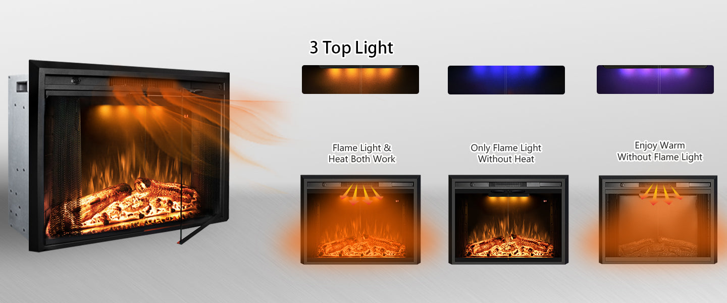 Flicker fuel bed and dancing flames bring a real fuel burning experience, optional 3 volume of crackling sound makes the real log burning effect adding sense of reality. Adjustable 3 flame and top light colors (yellow, blue, yellow-blue mixed) creates different ambiance